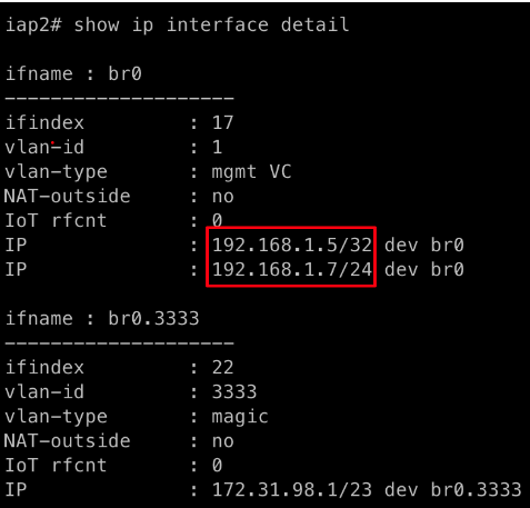 >> 테스트 결과 : iap 1 다운 상태에서 약 30초뒤 iap2에 virtual controller ip인 192.168.1.5 확인